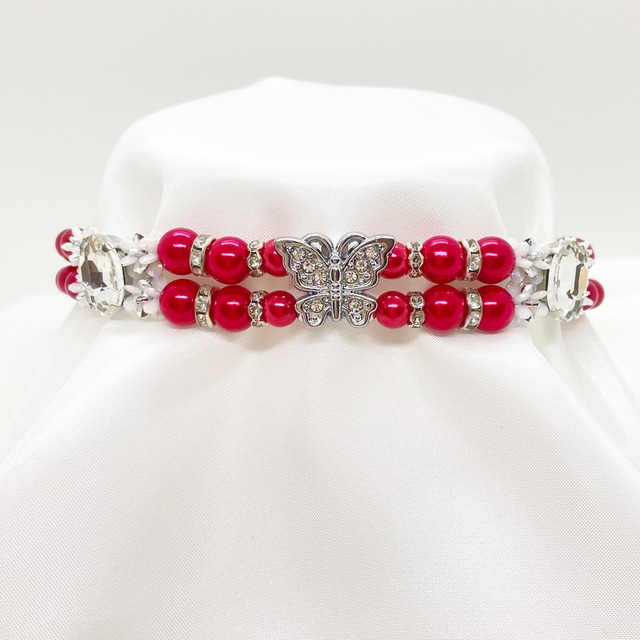 蝶々のメタルビーズがキラキラ輝く、綺麗なハーフチョークです。 〔全2カラーバリエーションあります〕 サイズ:首周り27cm〜頭周り32cm 《注意事項》※必ずお読みください。 ・首周りと頭周りを測定してください。 〔頭周りとは…アゴの下から頭の頂点まで〕 ※サイズに合った物をご購入ください。 特に、頭周りのサイズに誤りがございますと、着用出来ませんので充分にご注意下さい。 ・引っ張り癖・噛み癖のある子はオススメ出来ません。 ・完成品となりますので、サイズ変更は出来ません。ご了承くださいませ。 ・ビーズ・金具・ストーンは製造工程の上で、キズ・色むら・バリなどが発生する場合があります。 その旨、ご了承の上ご購入ください。 ・写真と実際の商品とイメージが若干異なる場合がございます。ご了承ください。 ・こちらはハンドメイド商品です。 完璧を求められる方はご遠慮ください。 ・安全にご使用いただく為に、定期的に点検して下さい。商品の劣化・ビーズの破損などにお気付きの場合、使用を中止し新しい物をご購入下さい。修理又は修正はしておりません。 ・小さなパーツを使用しておりますので、くれぐれもペットの誤飲にはご注意下さい。 ・本品ご使用中、いかなる事故等について一切の責任は負いかねますので、着用時はくれぐれもご注意下さい。 ・こちらの不備以外での返品はお受け出来ません。 ・保管の際は布で拭き取り直射日光を避けて下さい