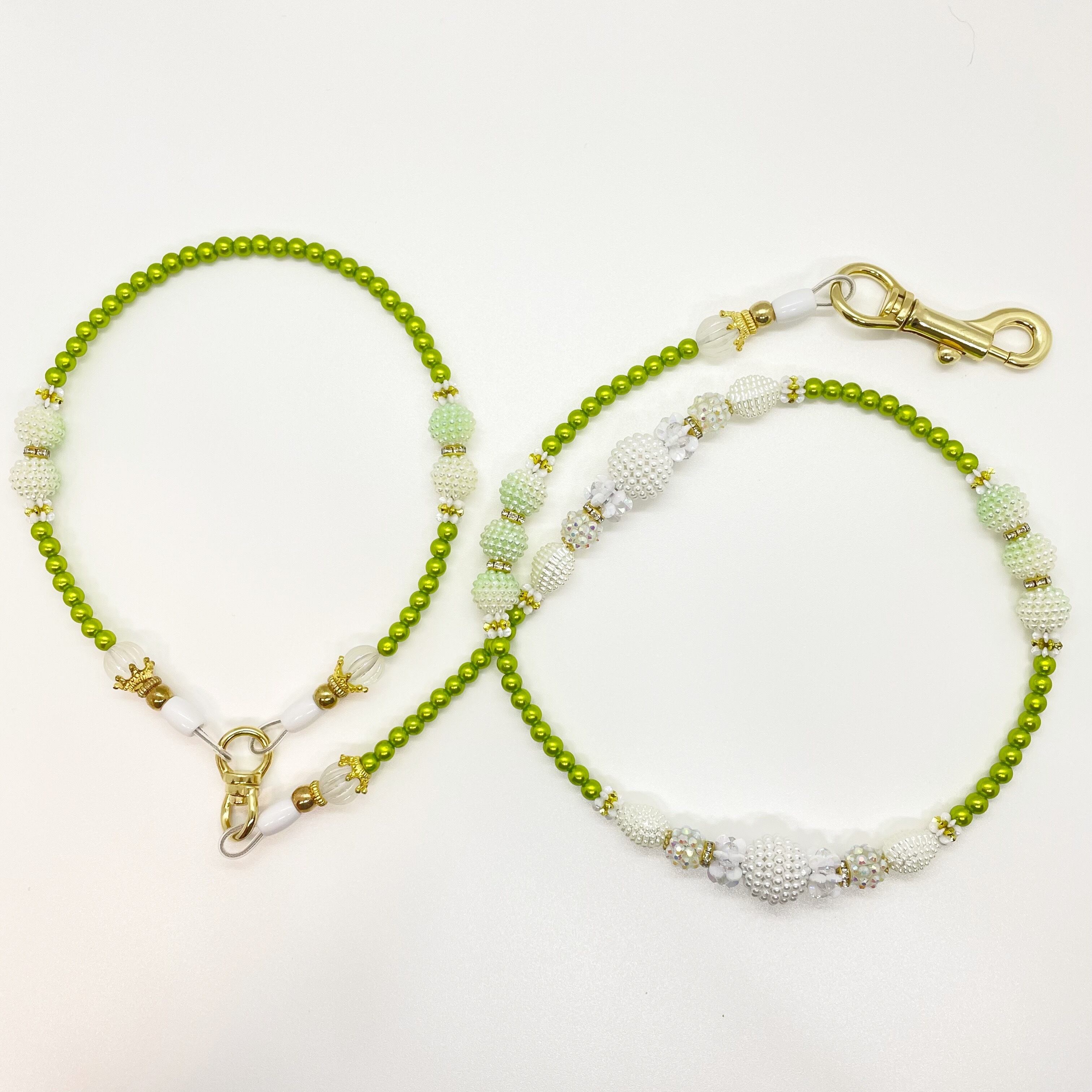 大きめのビーズボールに、オーロラのストーンが付いたビーズがキラキラ高級感のあるオシャレなリードです。