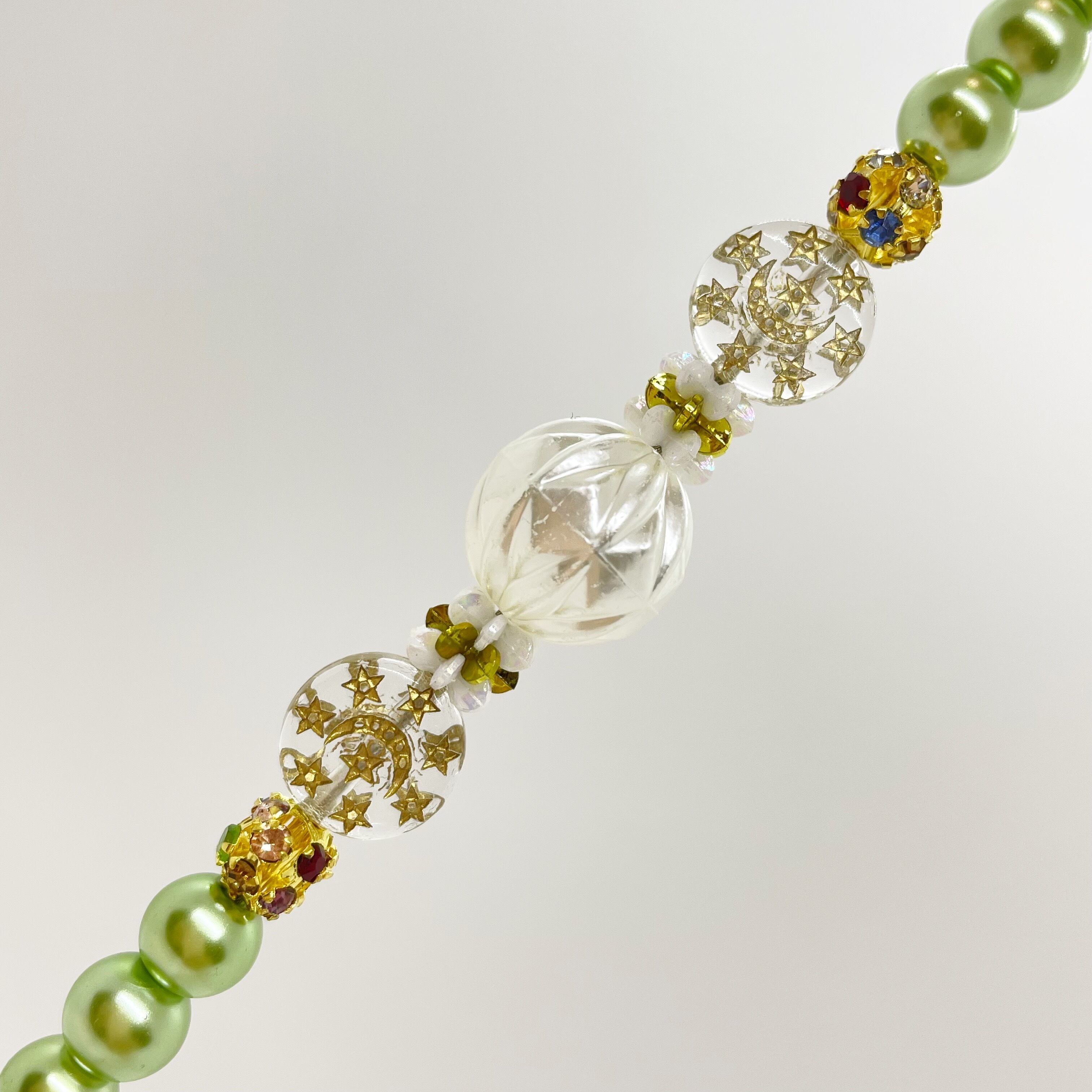 お花のスペーサービーズにミラーボールカットされたビーズがキラキラ輝き、アンティーク風ビーズがゴージャス感を出したビーズリードです。