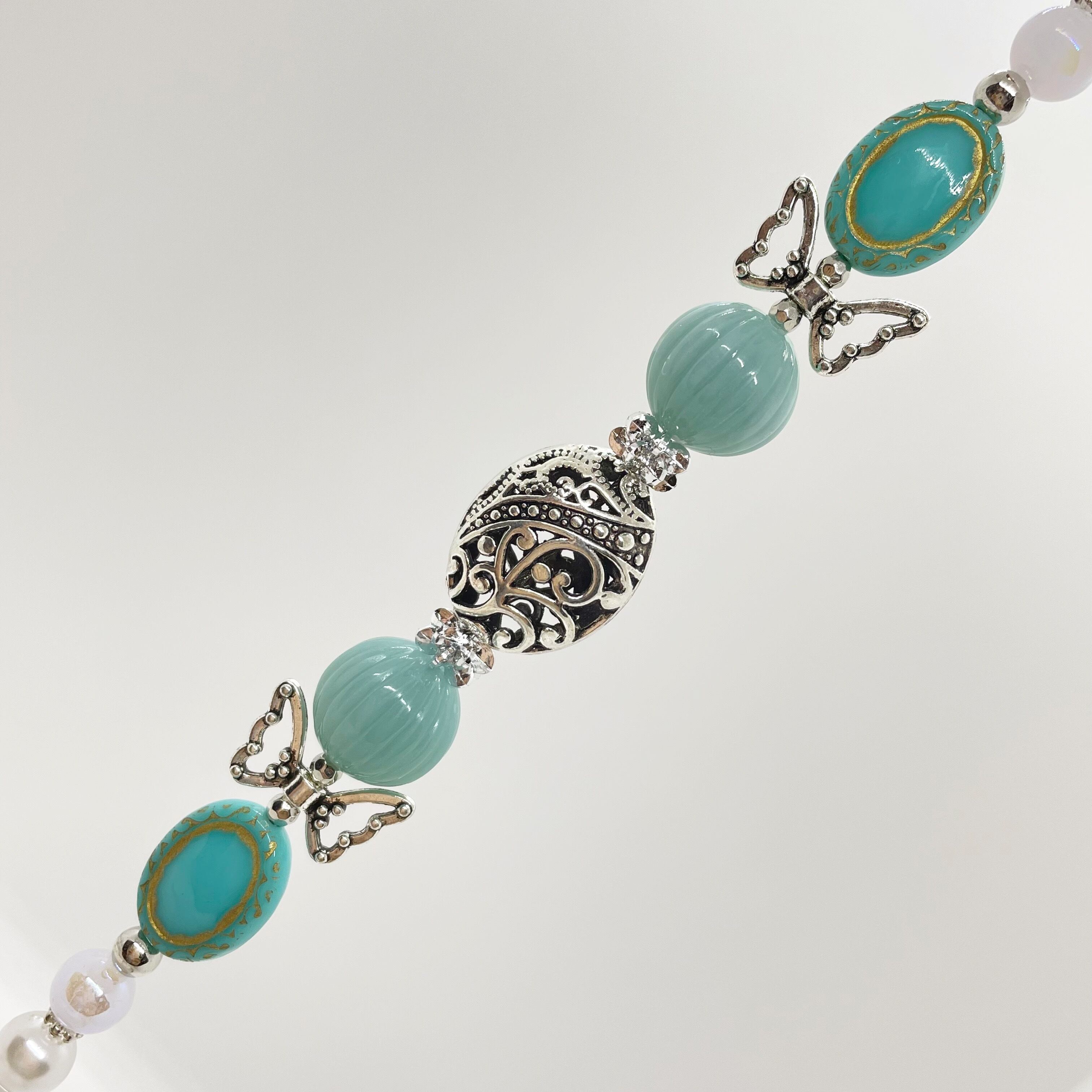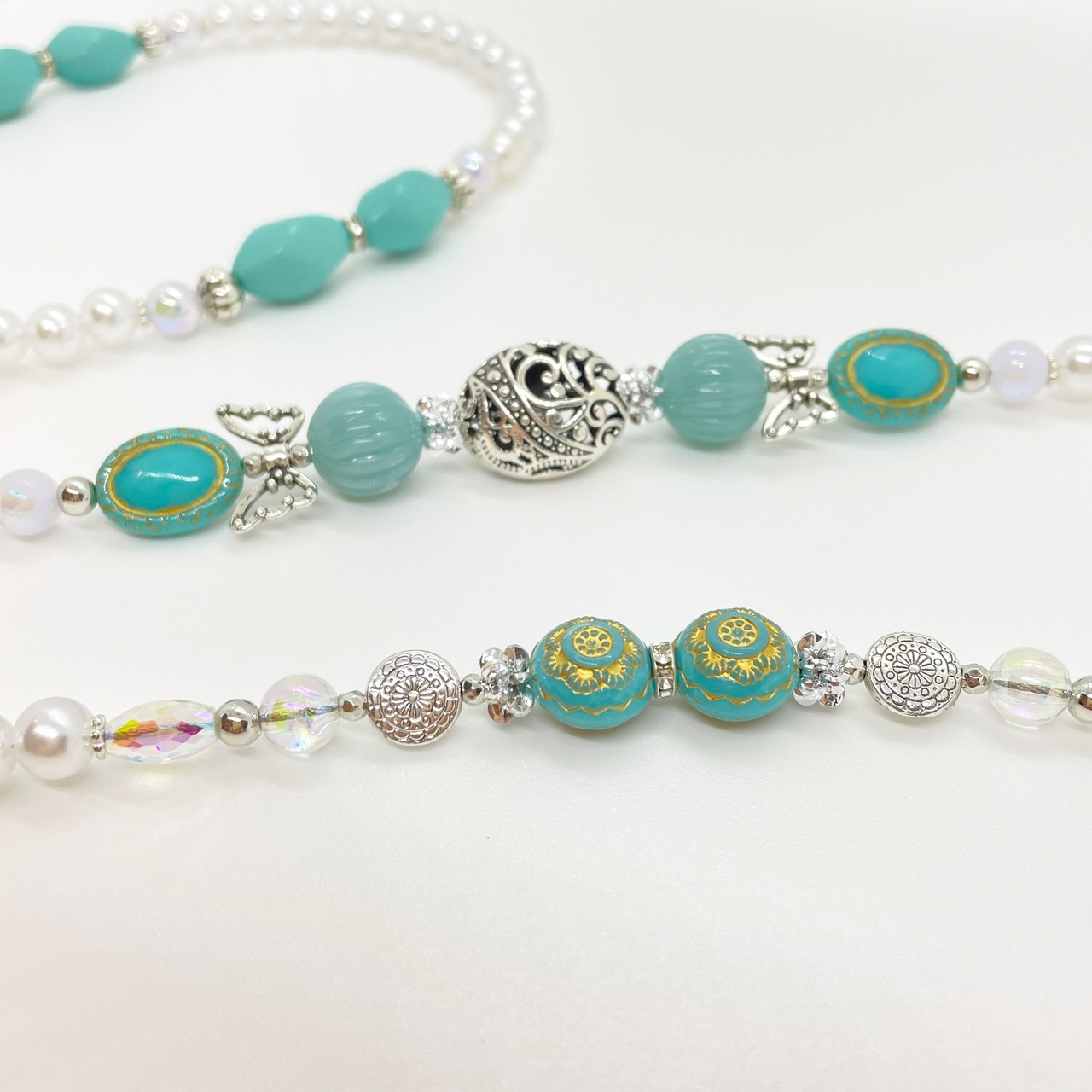 パールカラービーズに、ターコイズカラーのアンティーク風ビーズを組み合わせたゴージャスなビーズリードです。