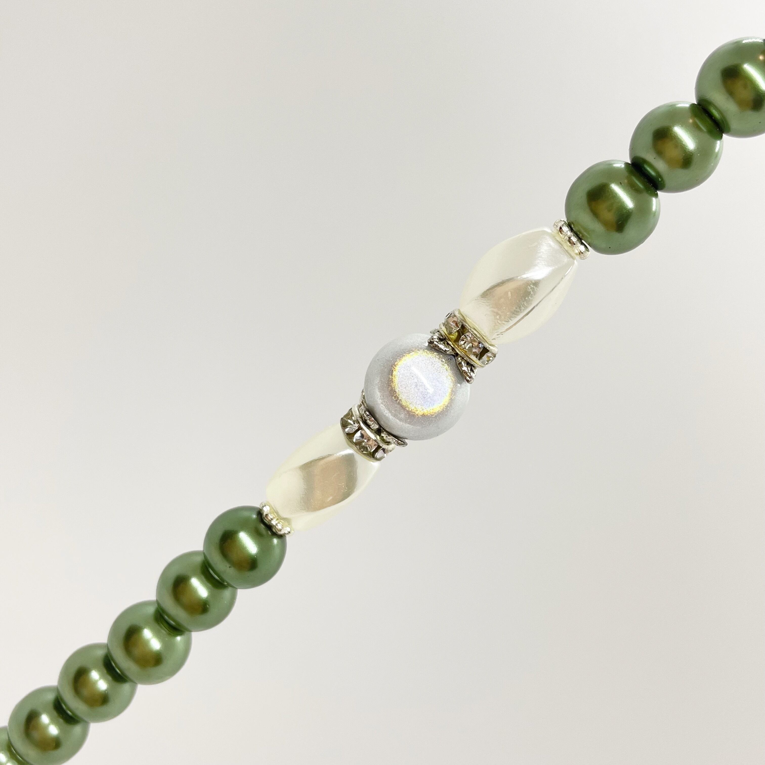 珍しい錯覚ビーズとツイストビーズを組み合わせてエレガントに、オーロラのハートビーズと天使のはねのメタルビーズが可愛らしいビーズリードです。