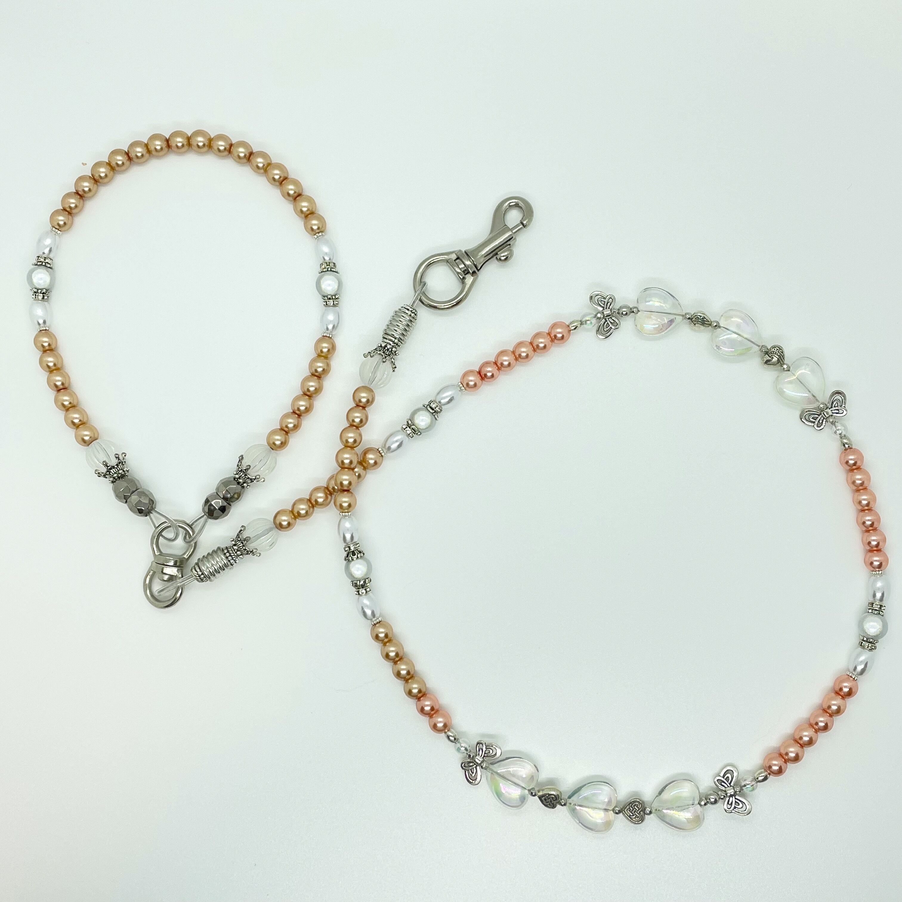 珍しい錯覚ビーズとツイストビーズを組み合わせてエレガントに、オーロラのハートビーズと蝶々のメタルビーズが可愛らしいビーズリードです。