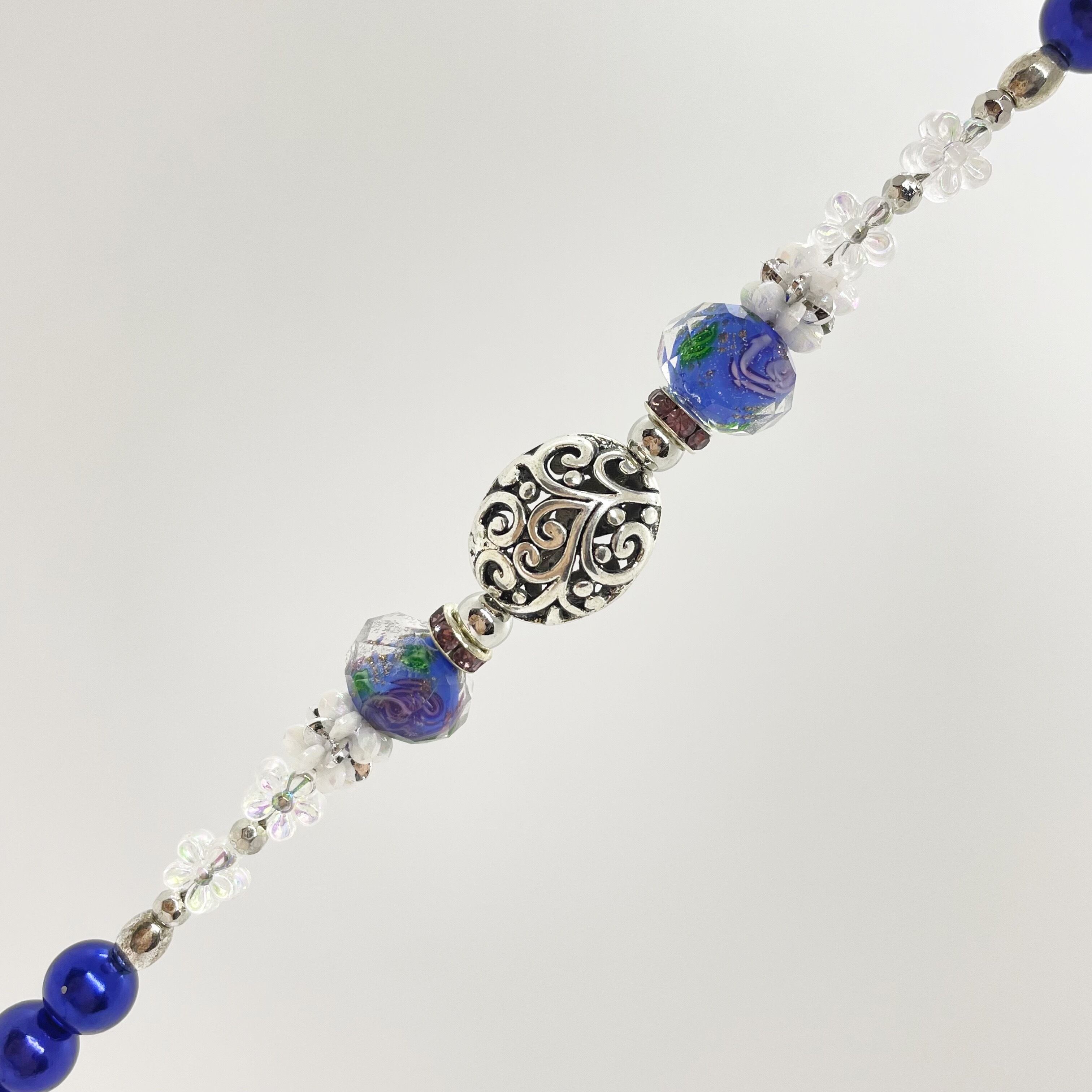 お花が描かれたビーズに、大きめのメタルビーズがゴージャスで、マットカラーの白いお花のビーズは光が当たるとキラキラ輝くエレガントで上品なビーズリードです。