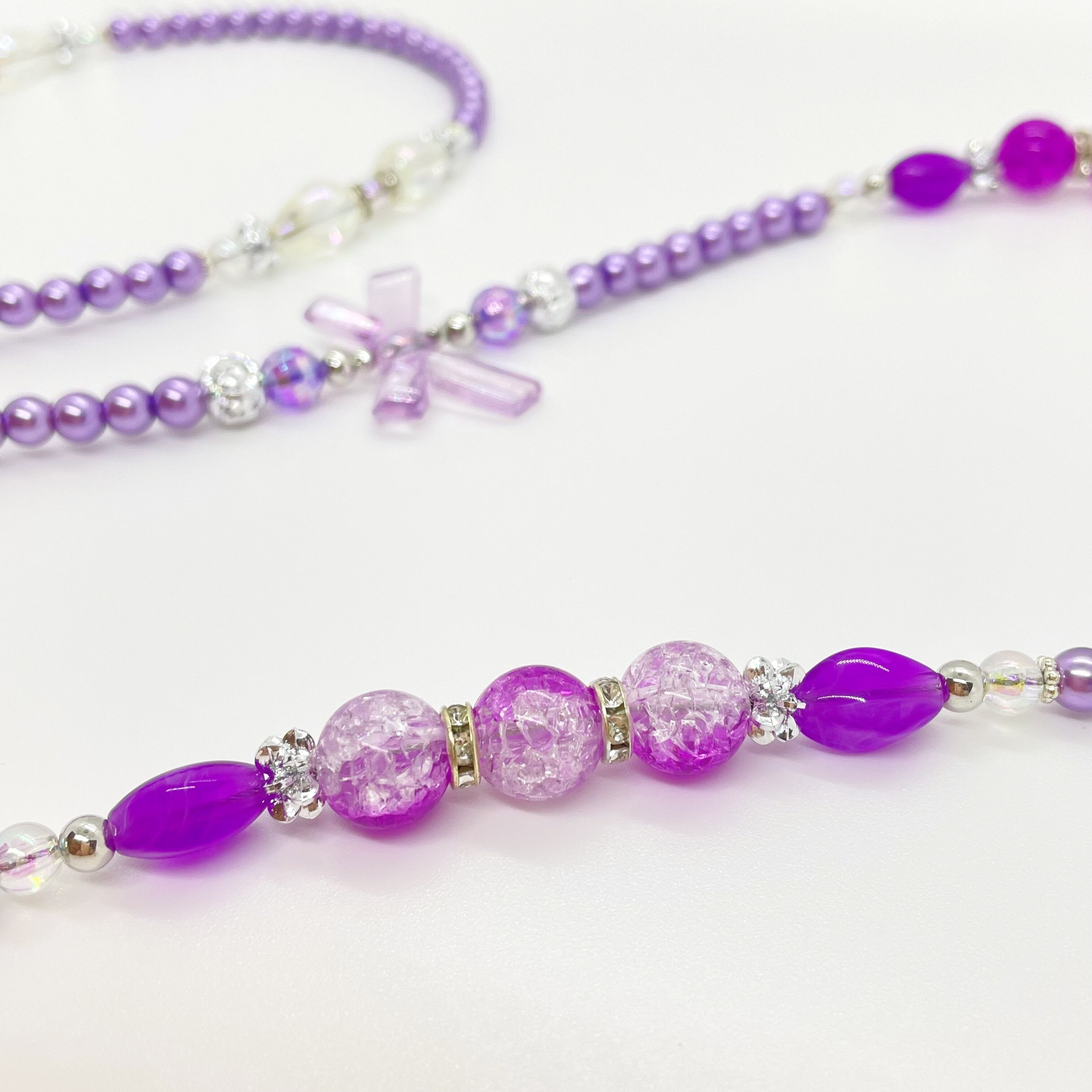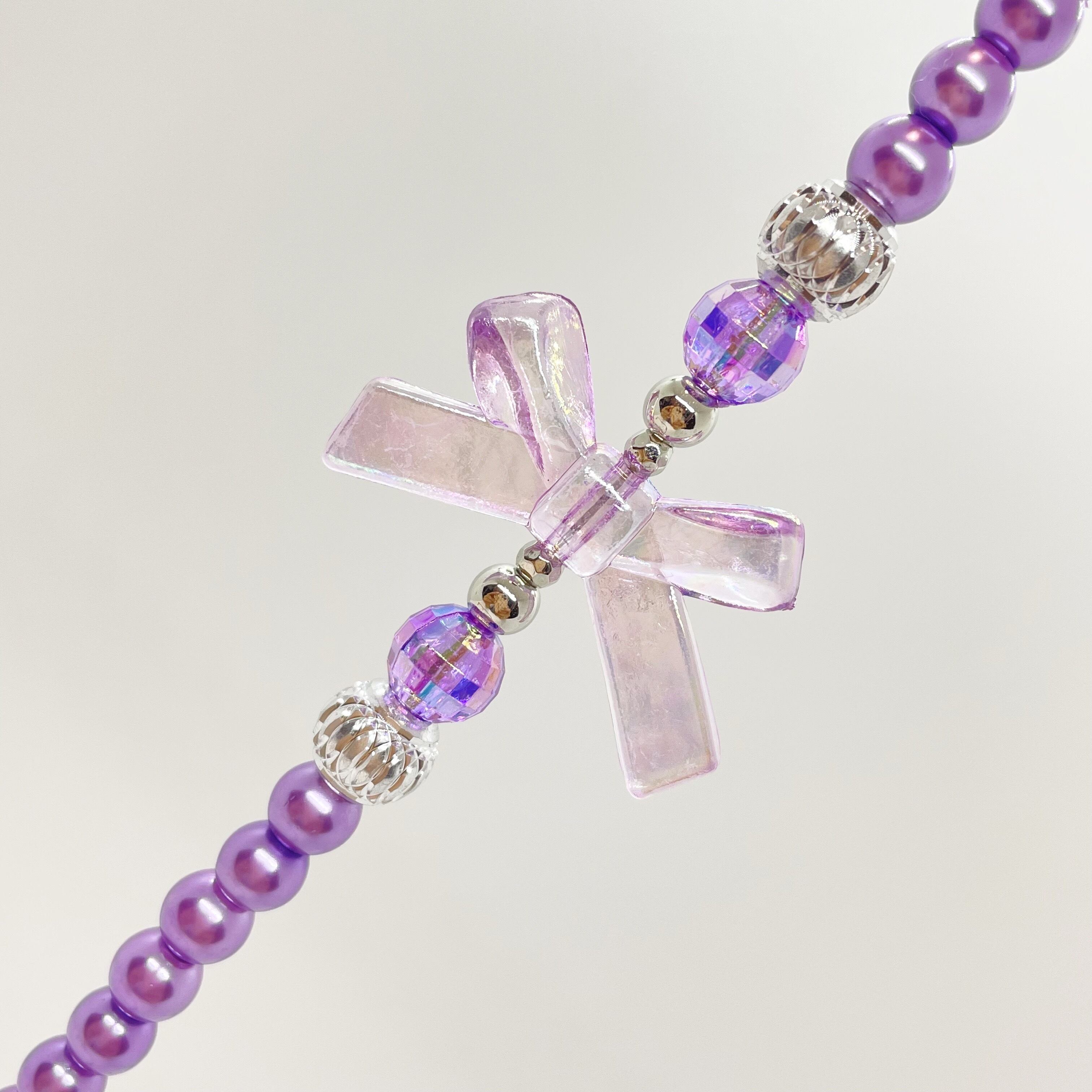 リボンのビーズに、パープルのクラックビーズを組み合わせた可愛らしいビーズリードです。