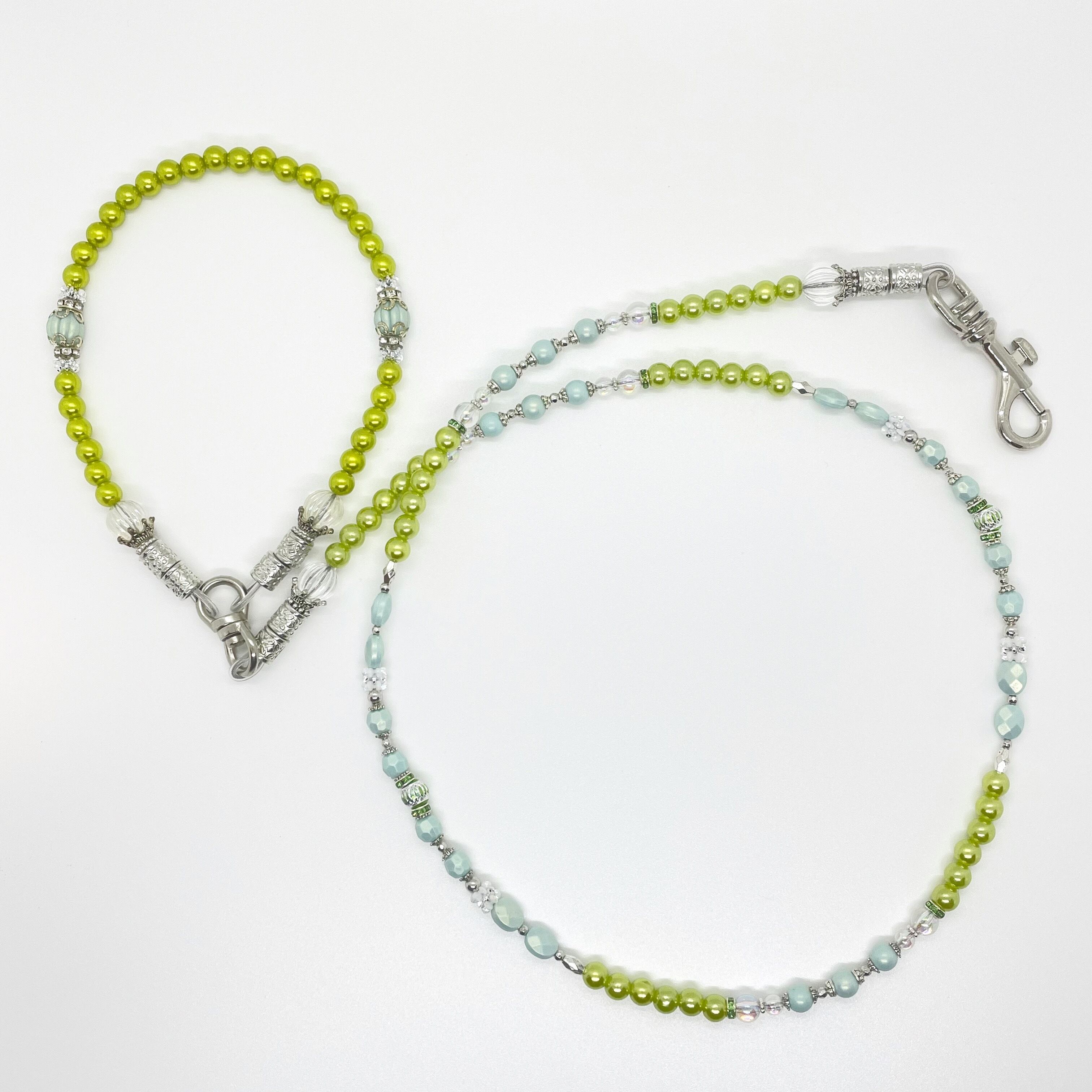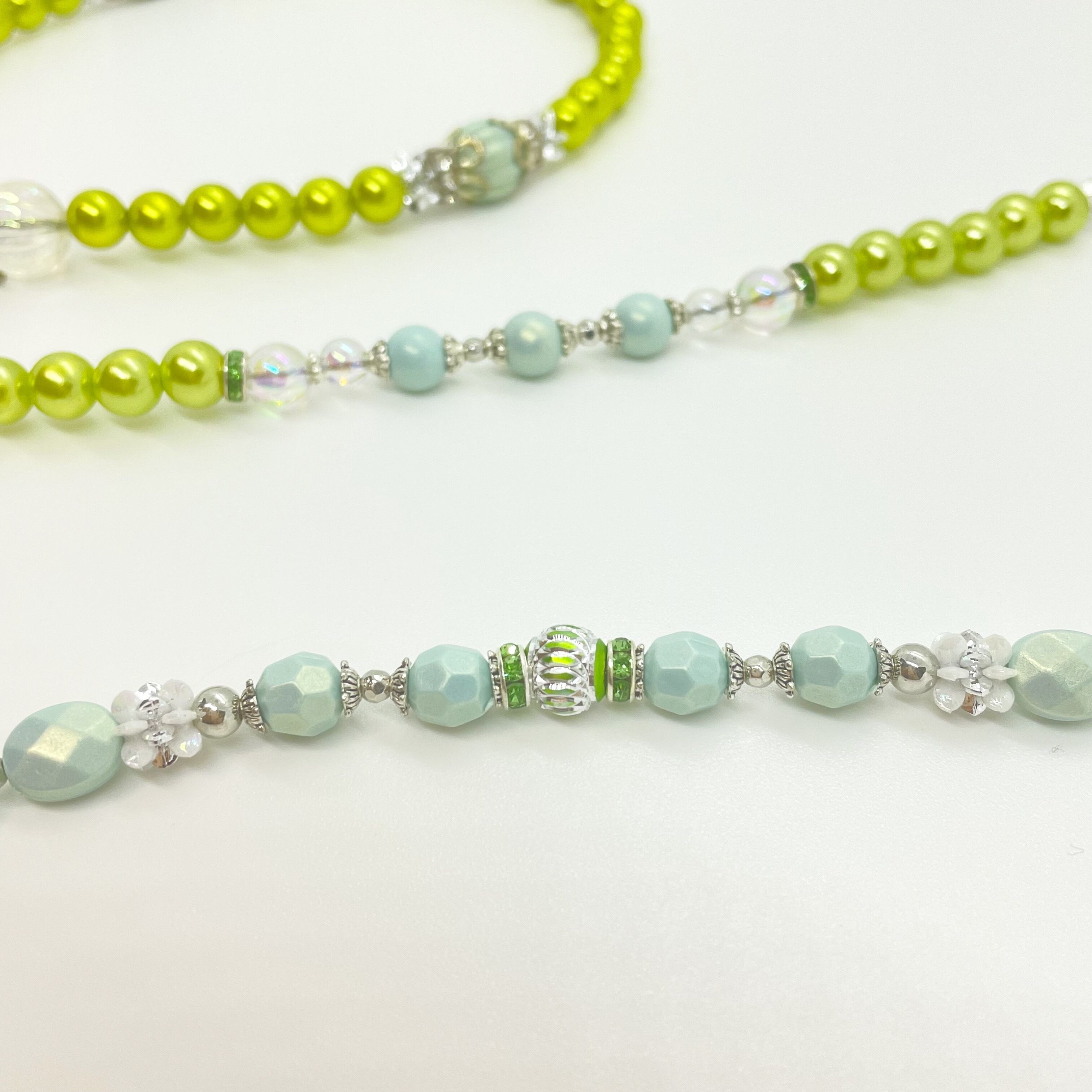 グリーン系に統一されたビーズに、マットカラービーズとメタルビーズがエレガントなリードです。