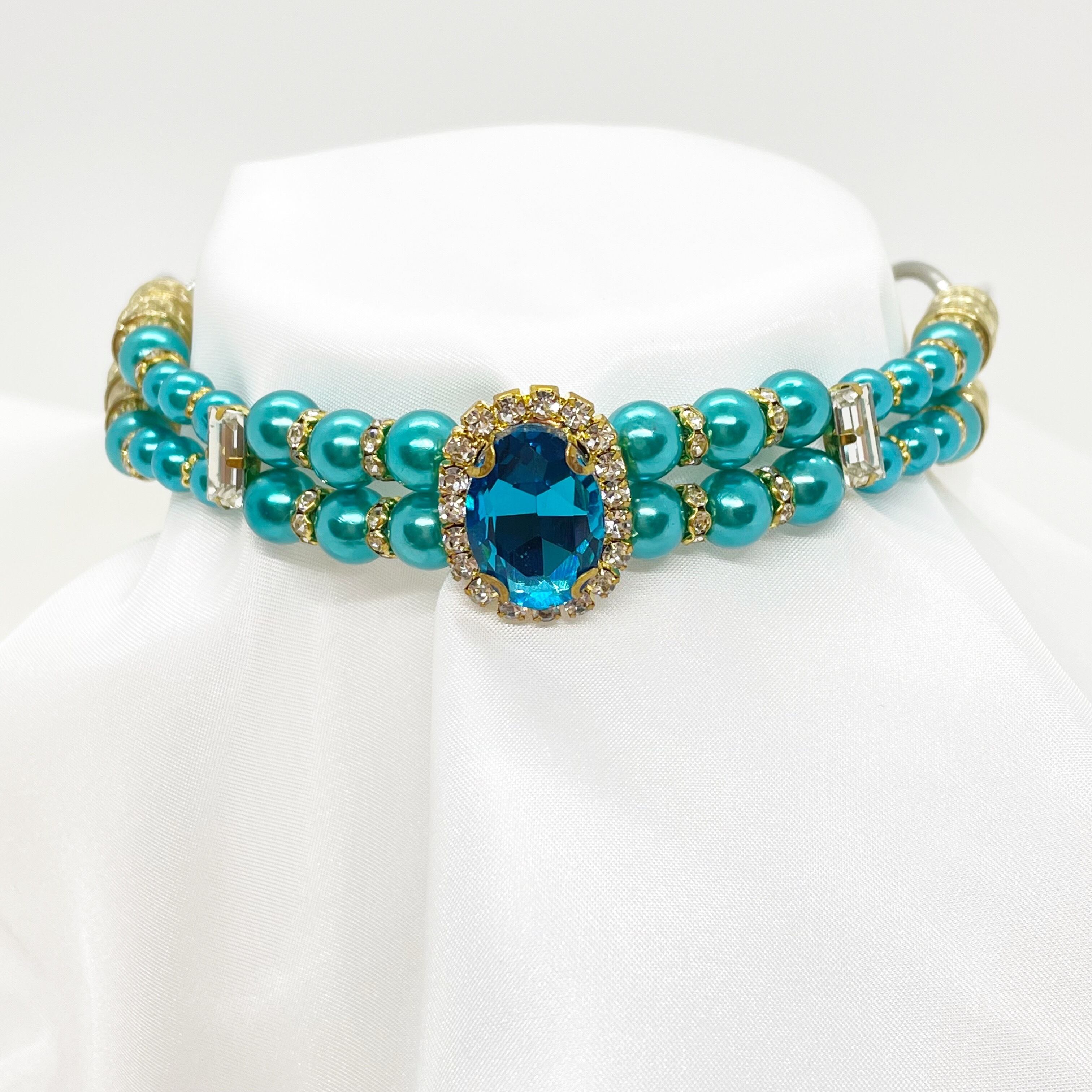 トップにキラキラ輝くスクエアビーズと、サイドにクリスタルストーンを付けたゴージャスなハーフチョークです。