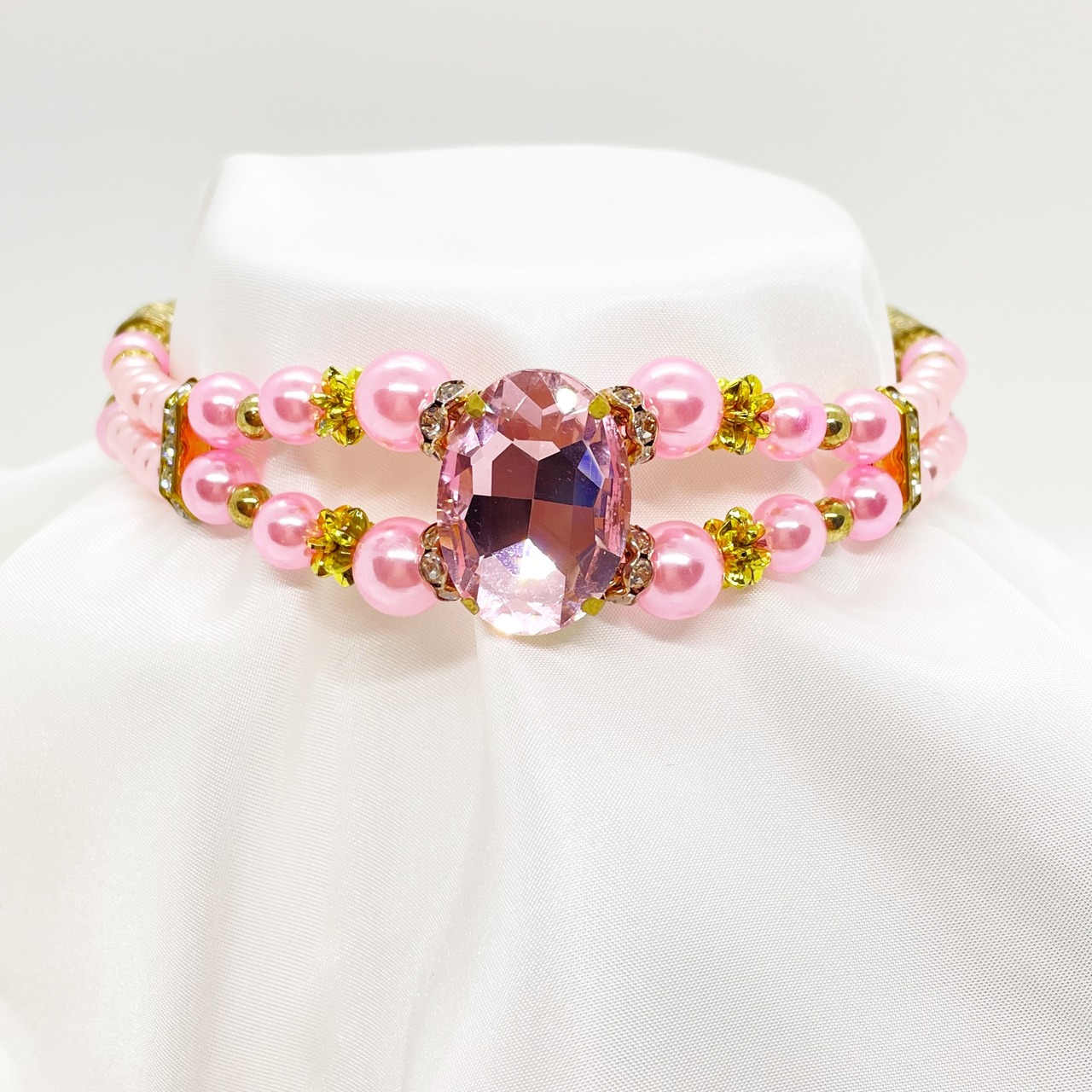 ピンクカラーのスクエアビーズがエレガントでゴージャスな迫力のあるハーフチョークです。