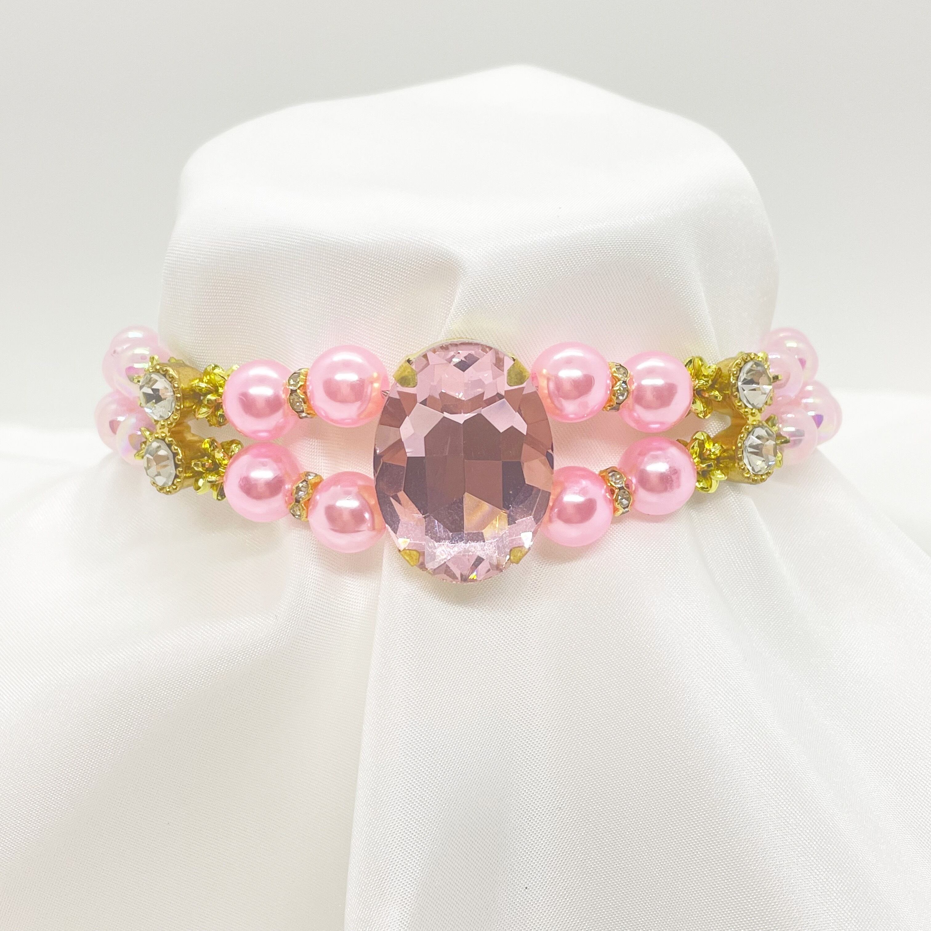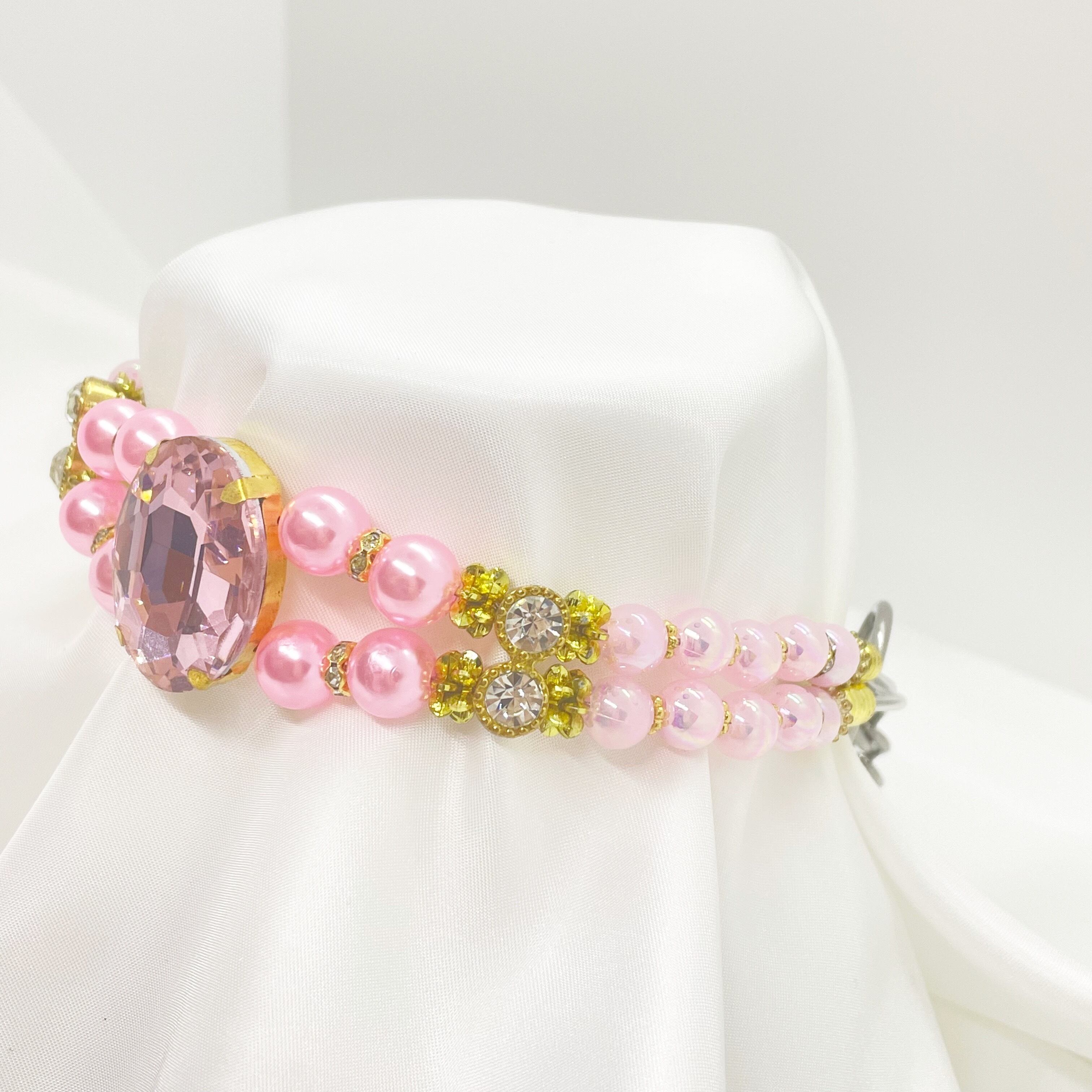 大きなスクエアビーズの両サイドに、2連のクリスタルストーンビーズがキラキラ輝くゴージャスなハーフチョークです。