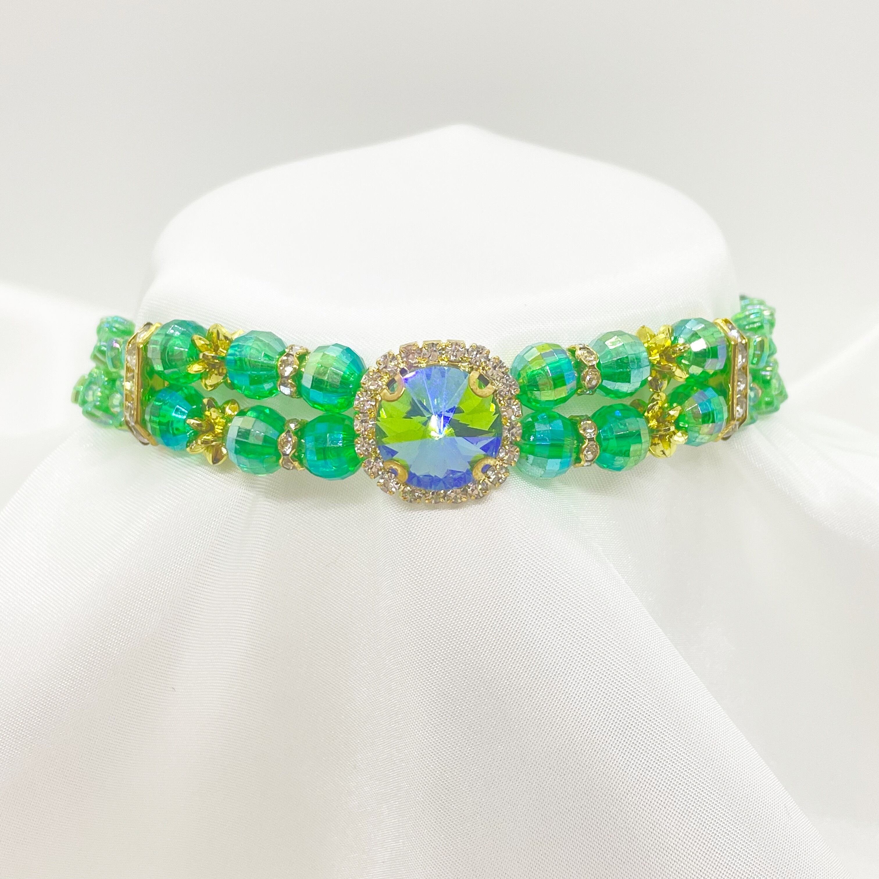スクエアビーズがトップで虹色に輝き、お花のビーズが可愛らしさを出した綺麗でエレガントなハーフチョークです。