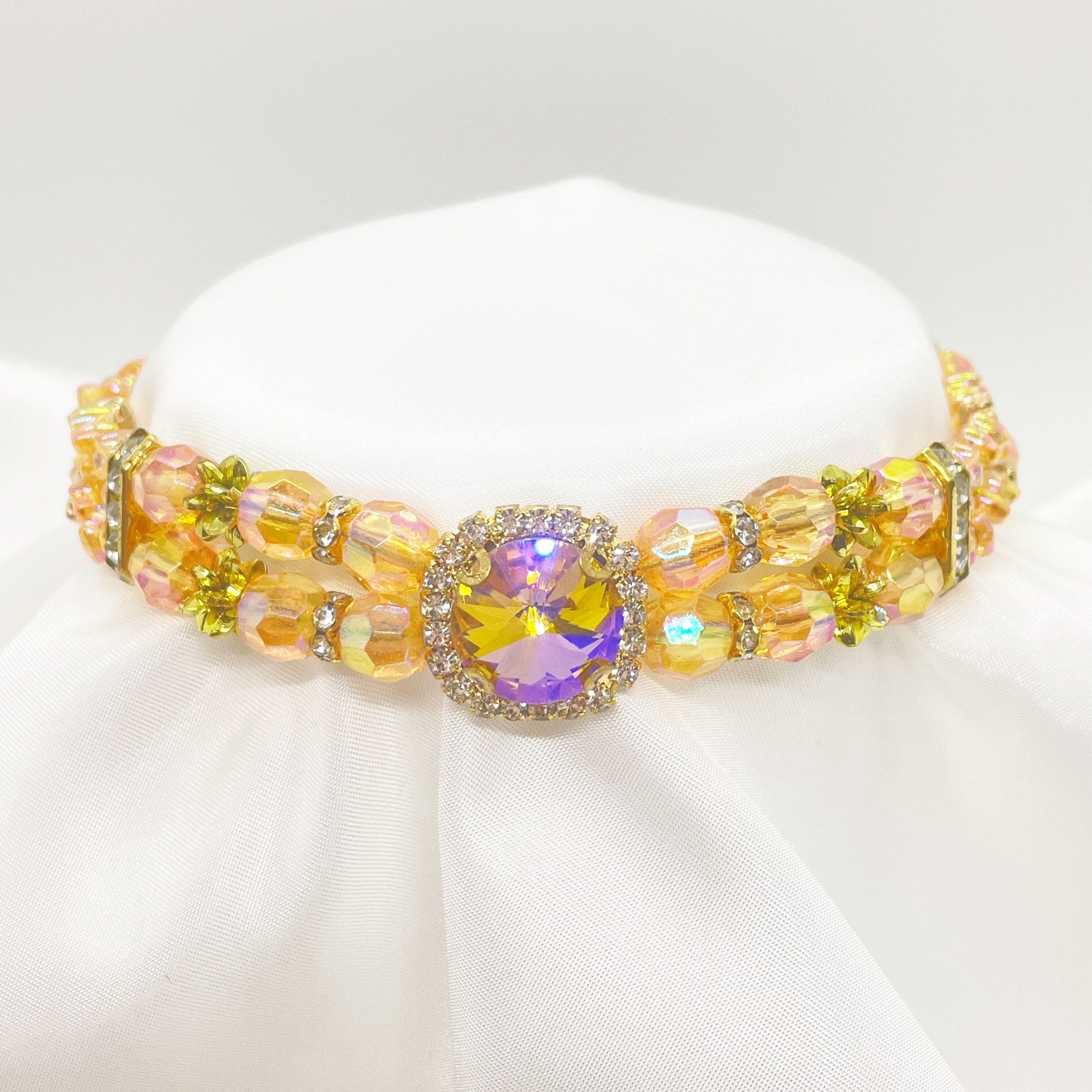 スクエアビーズがトップで虹色に輝き、お花のビーズが可愛らしさを出した、綺麗でエレガントなハーフチョークです。