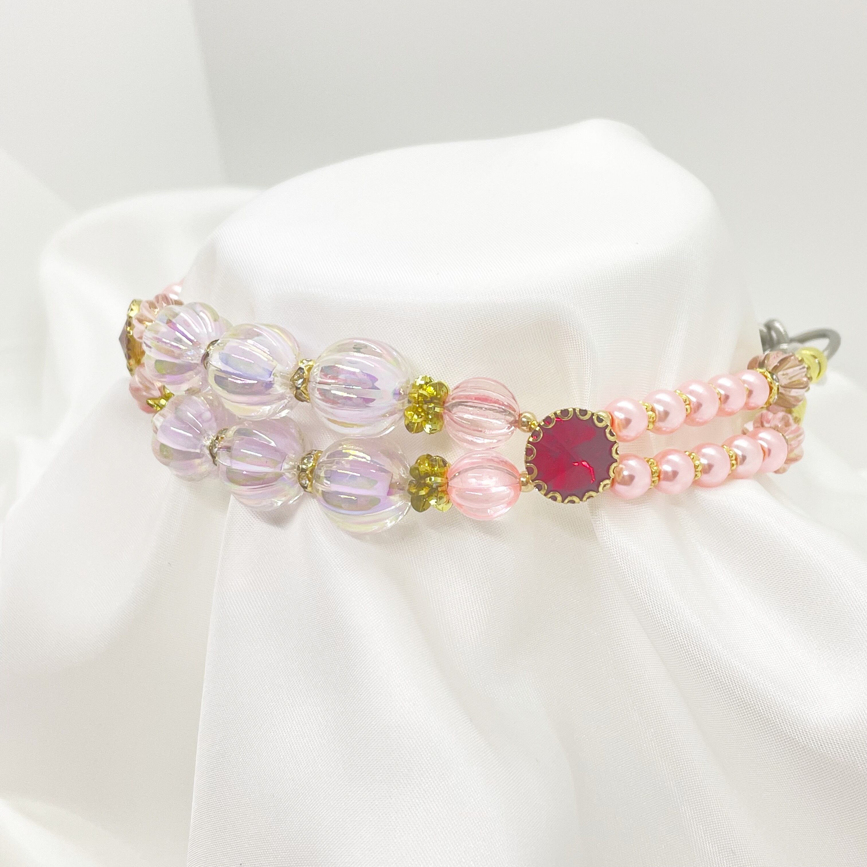 左右に一つずつスクエアビーズが付いていて、トップのオーロラビーズが華やかさを出した綺麗なハーフチョークです。
