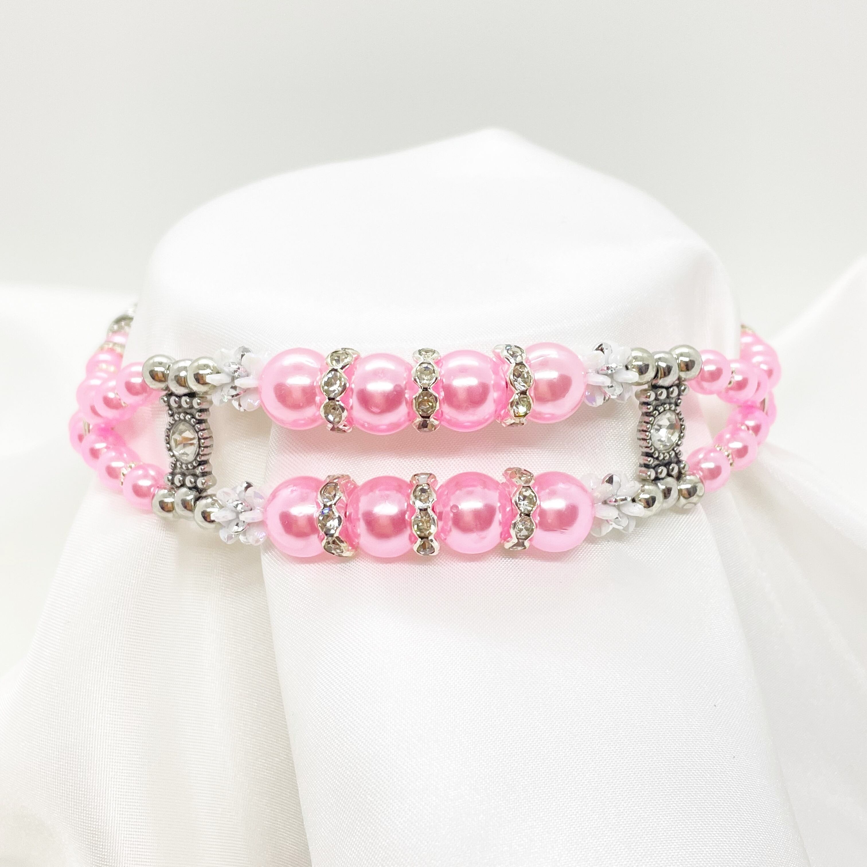 上品なパール風ビーズに、左右のメタルストーンがクールで綺麗なハーフチョークです。