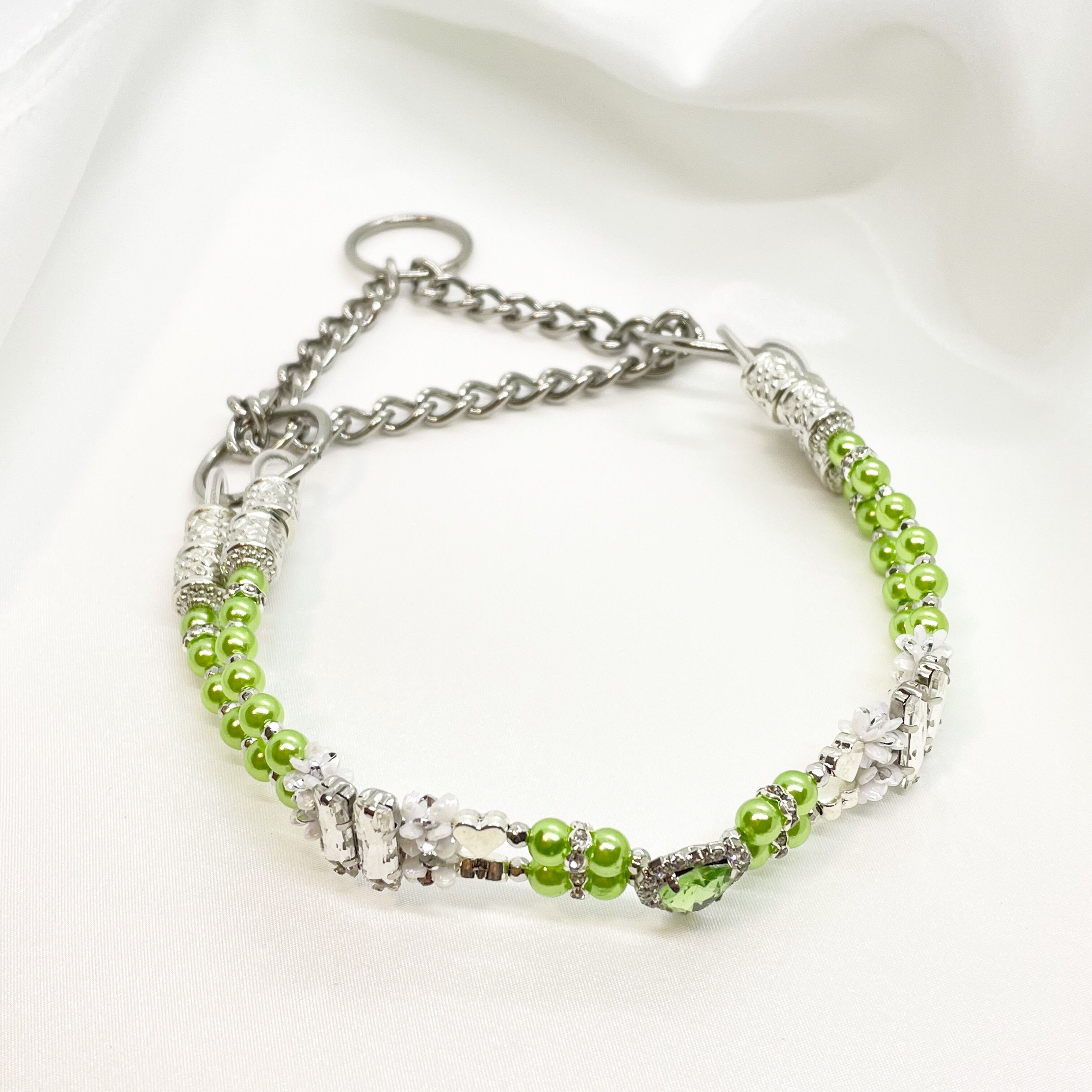 キラキラ輝くハートのストーンの周りを、ハートののメタルビーズを組み合わせたオシャレで可愛らしいハーフチョークです。