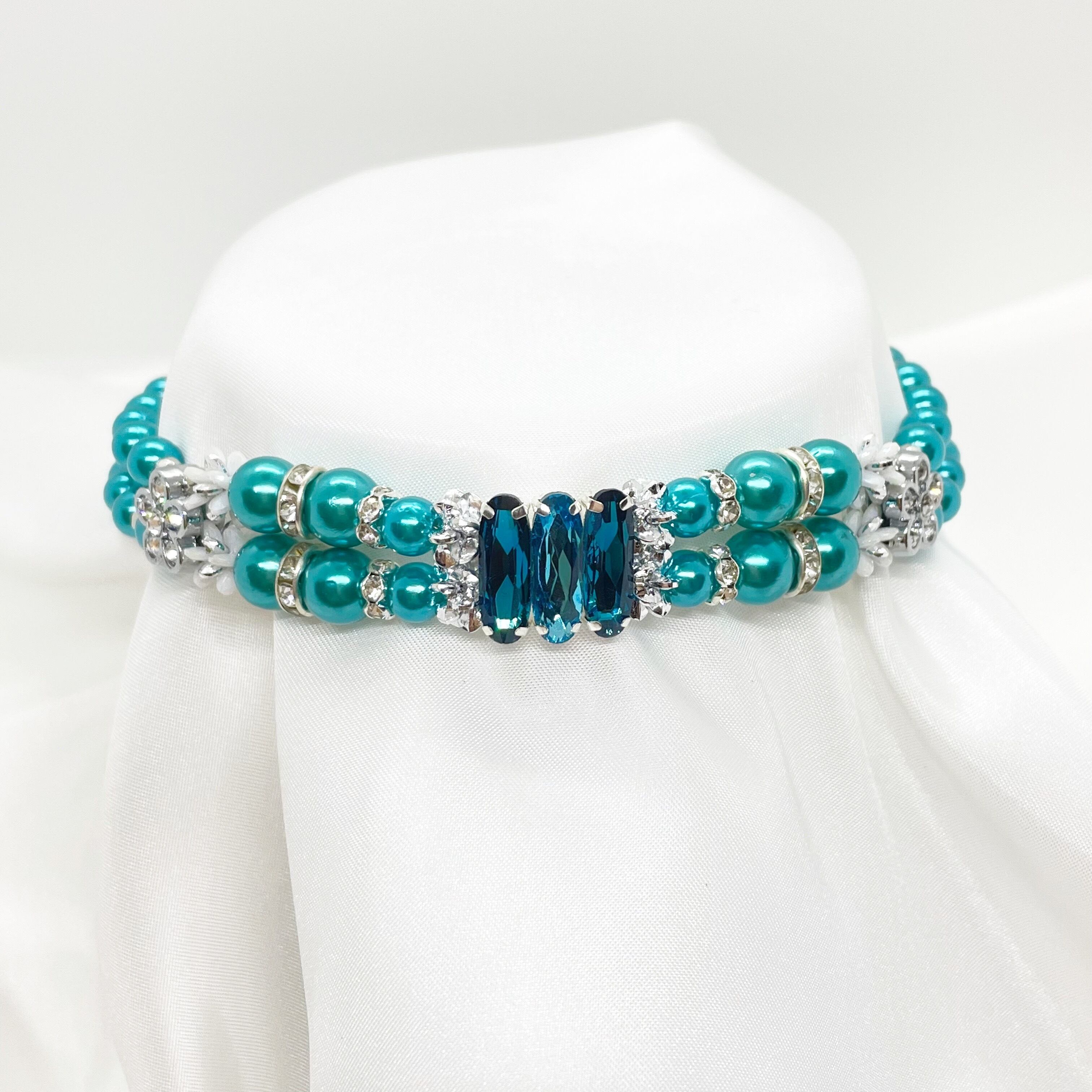 お花のスクエアビーズがキラキラ輝き、3連ストーンと組み合わせた華やかに彩るオシャレなハーフチョークです。