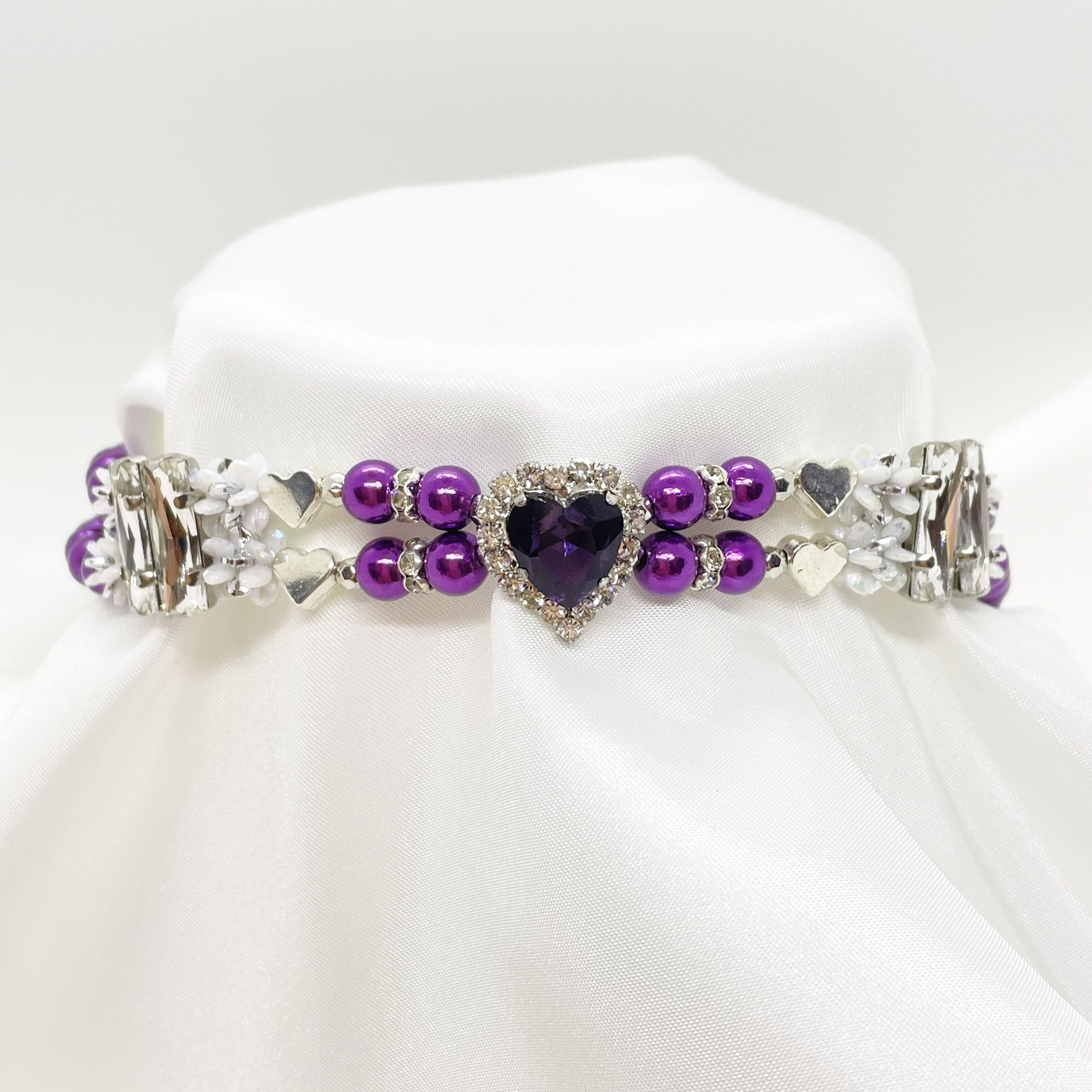 キラキラ輝くハートのストーンの周りを、ハートのメタルビーズを組み合わせたオシャレで可愛らしいハーフチョークです。