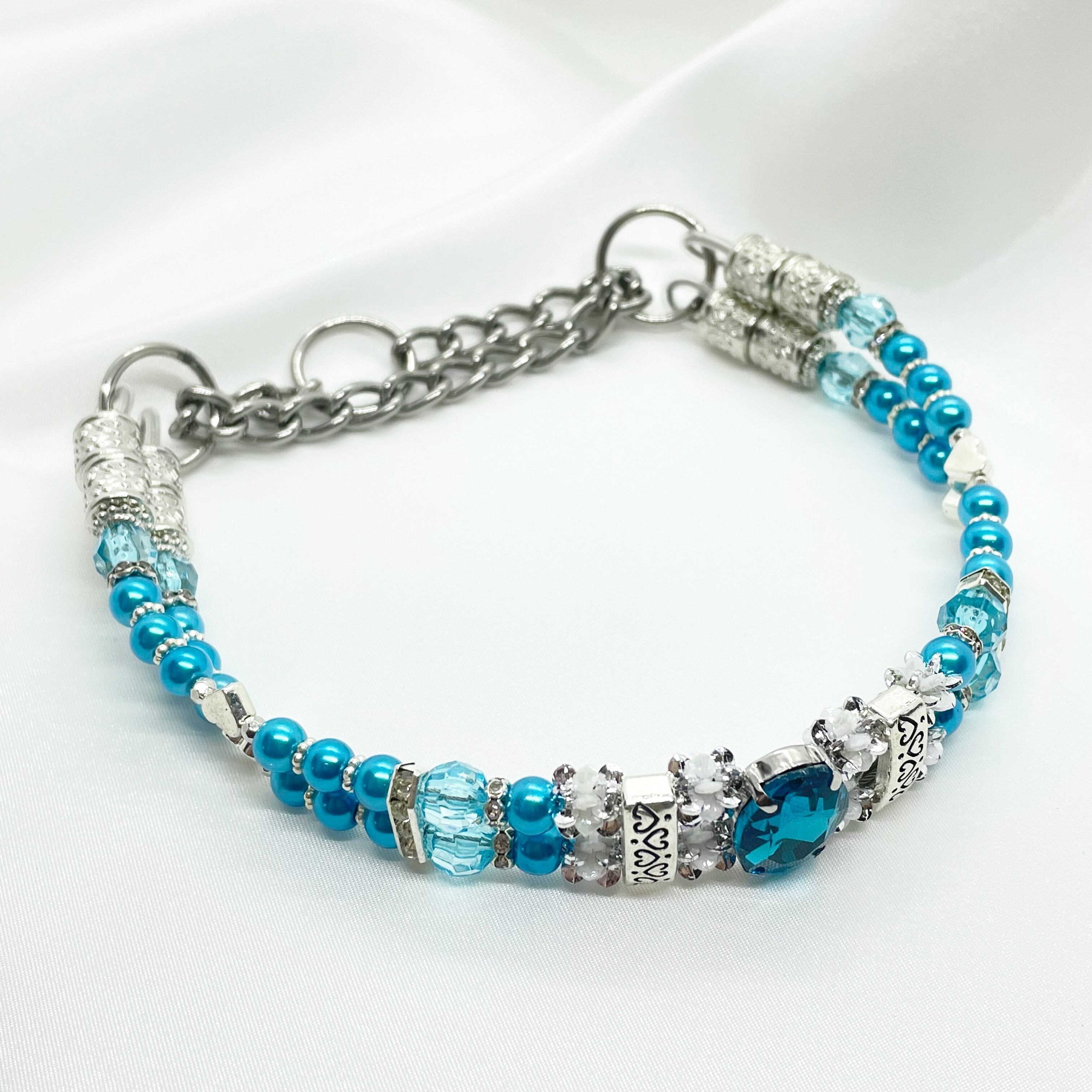 中央のスクエアビーズがキラキラ輝き、その周りにハートのメタルビーズを組み合わせた可愛らしいハーフチョークです。