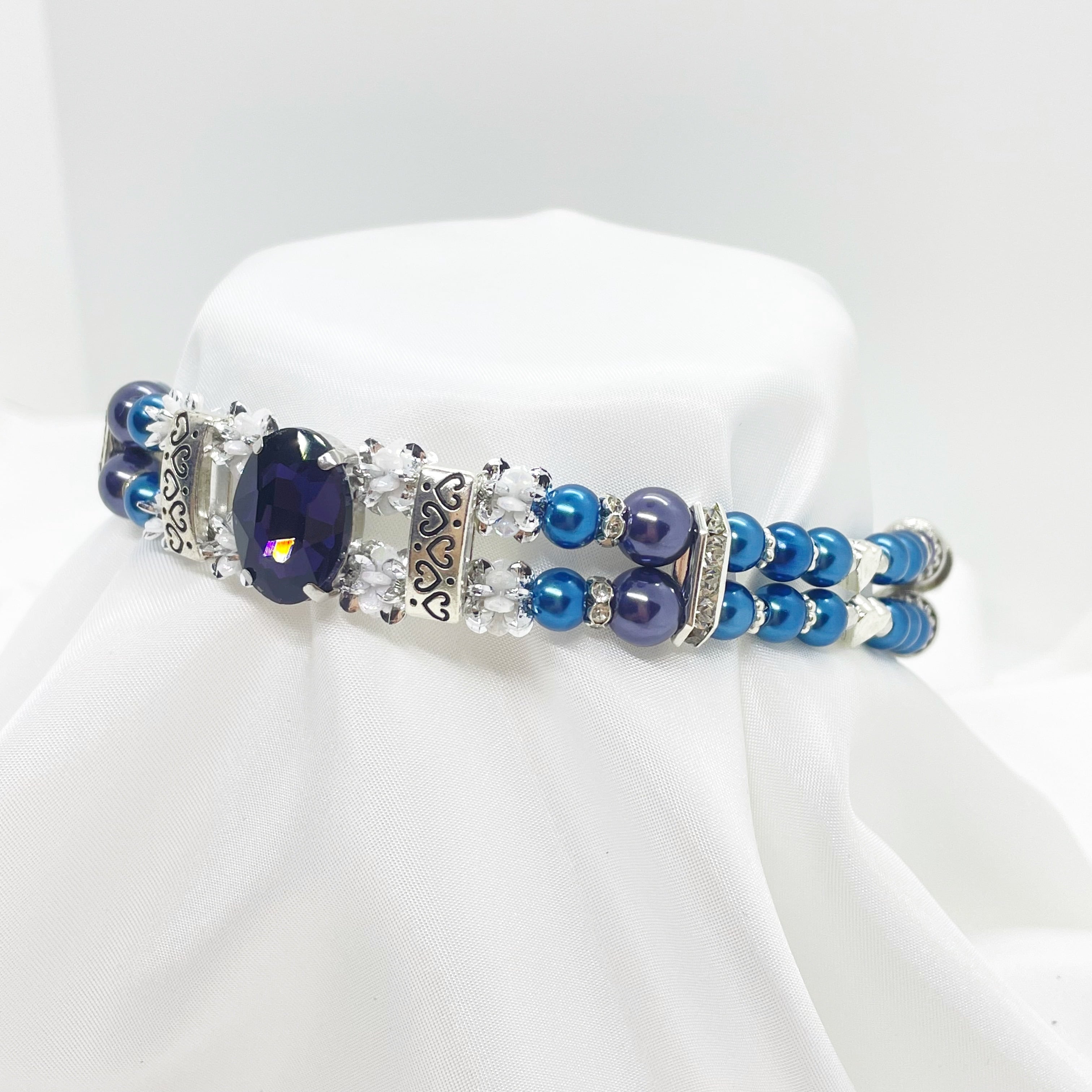 中央のスクエアビーズがキラキラ輝き、その周りにハートのメタルビーズを組み合わせた可愛らしいハーフチョークです。