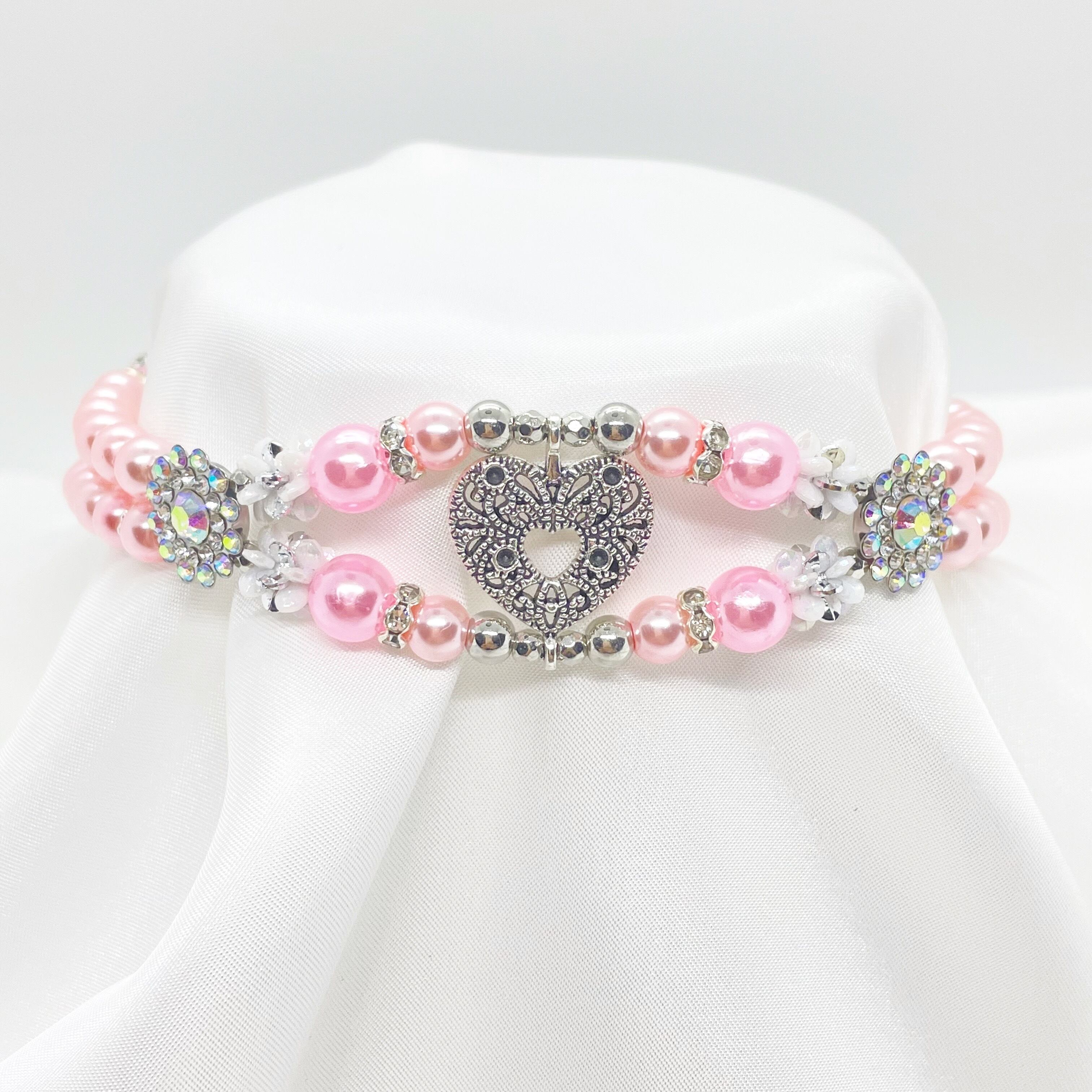 ハートの形をしたアンティーク風ビーズに、虹色に輝く華やかなグラデーションビーズを組み合わせた綺麗で可愛らしいハーフチョークです。