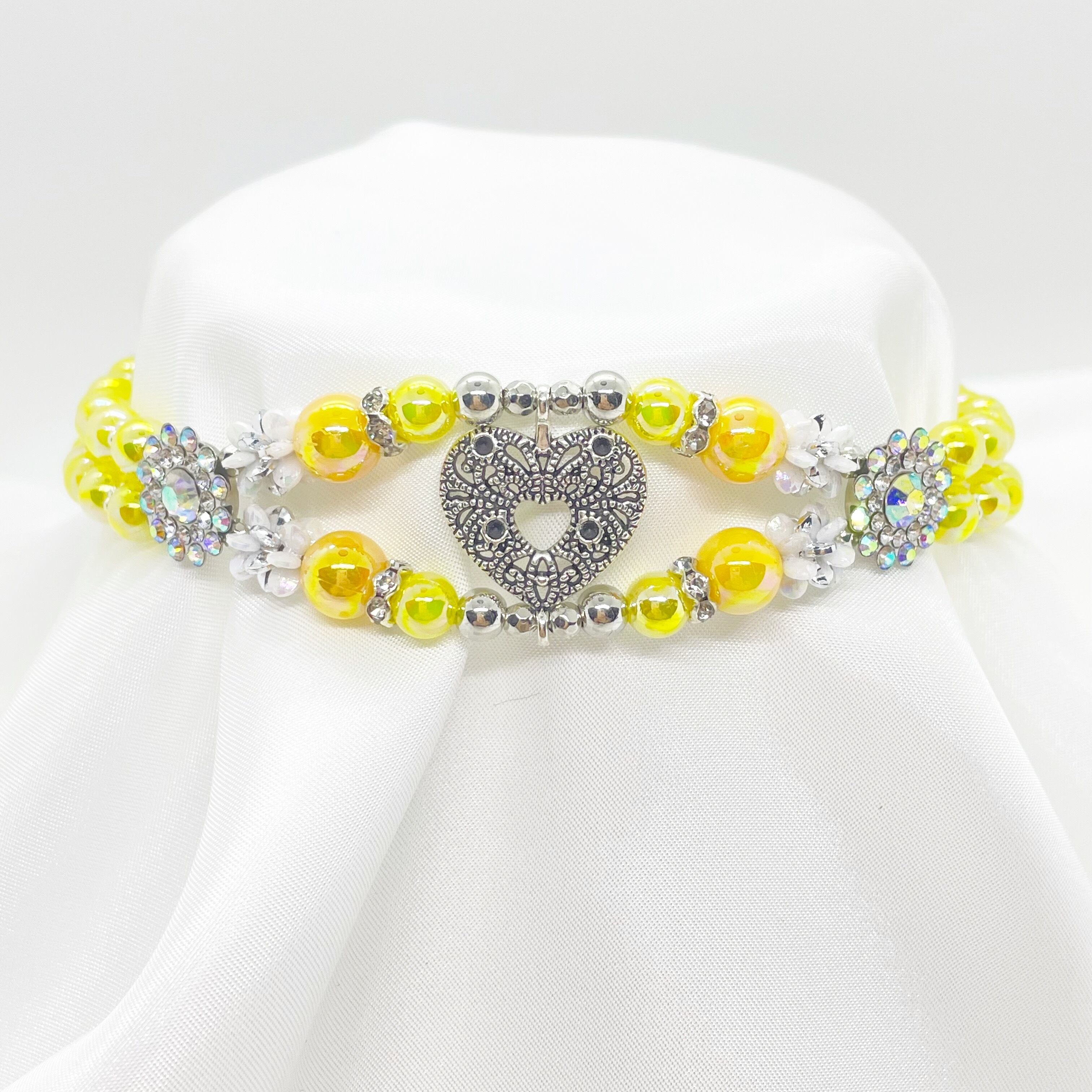 ハートの形をしたアンティーク風ビーズに、虹色に輝く華やかなグラデーションビーズを組み合わせた綺麗で可愛らしいハーフチョークです。