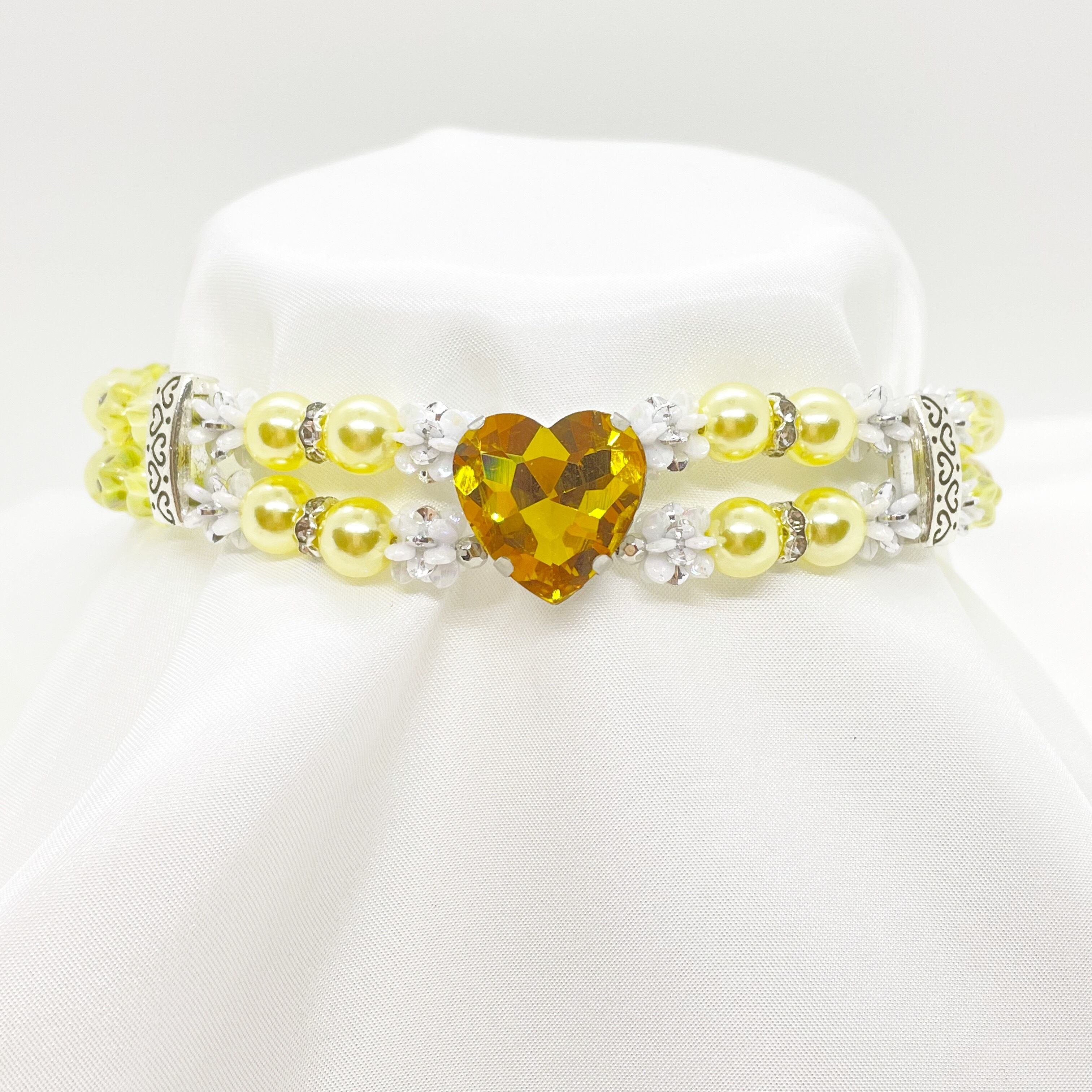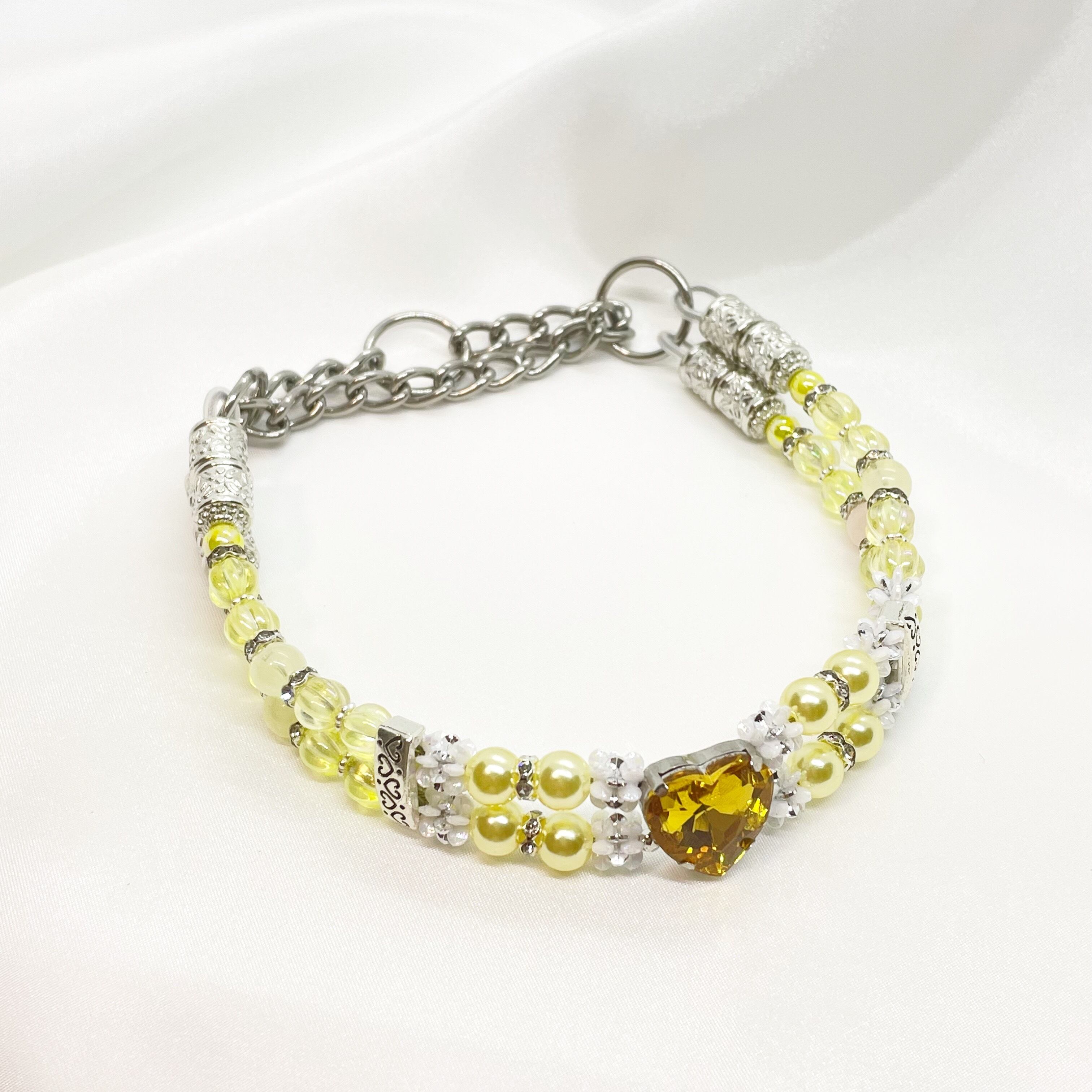 ハートのスクエアビーズに、左右のメタルビーズもハートで可愛らしいエレガントなハーフチョークです。