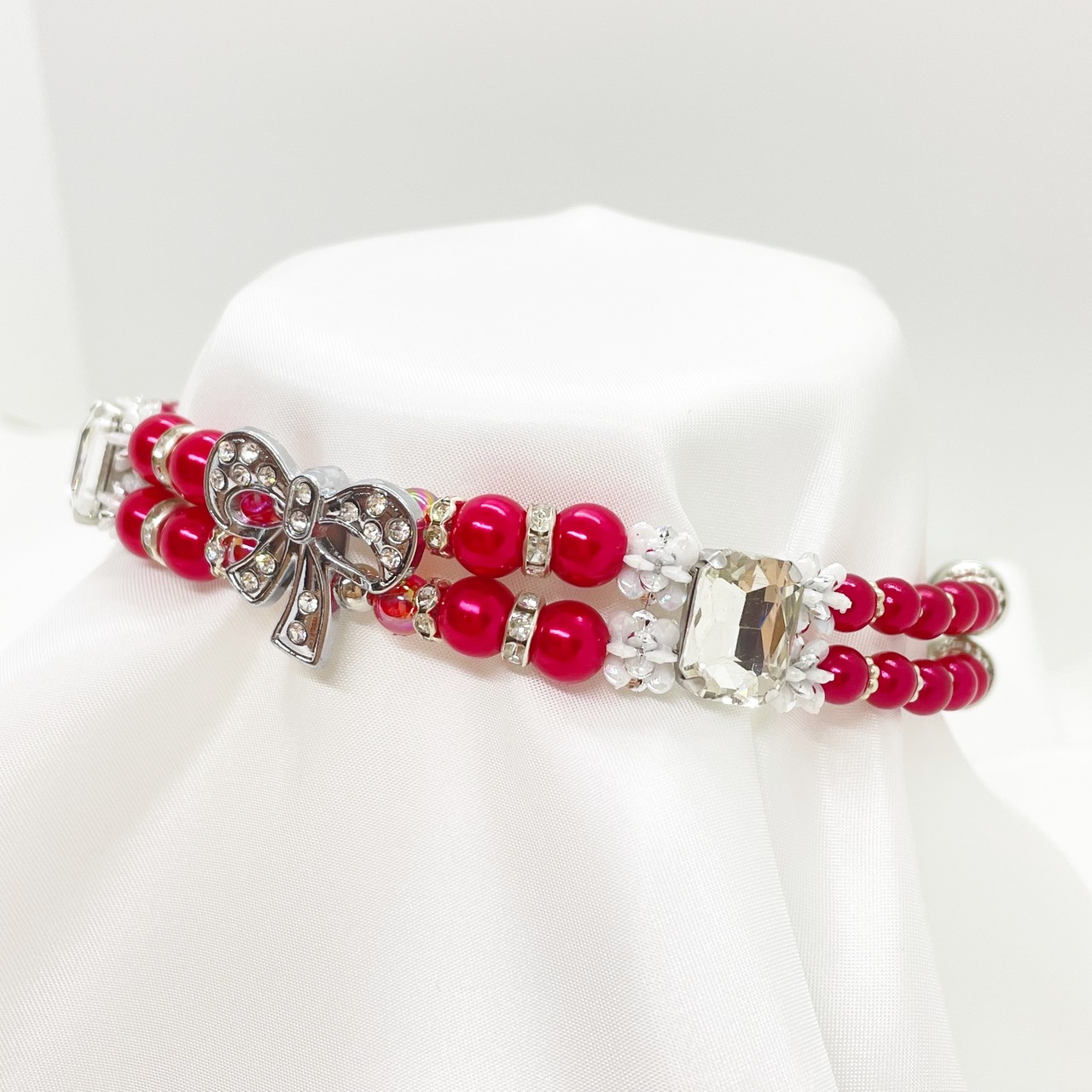 リボンのメタルビーズがキラキラ輝き、両サイドのスクエアビーズと組み合わせた可愛くエレガントなハーフチョークです。