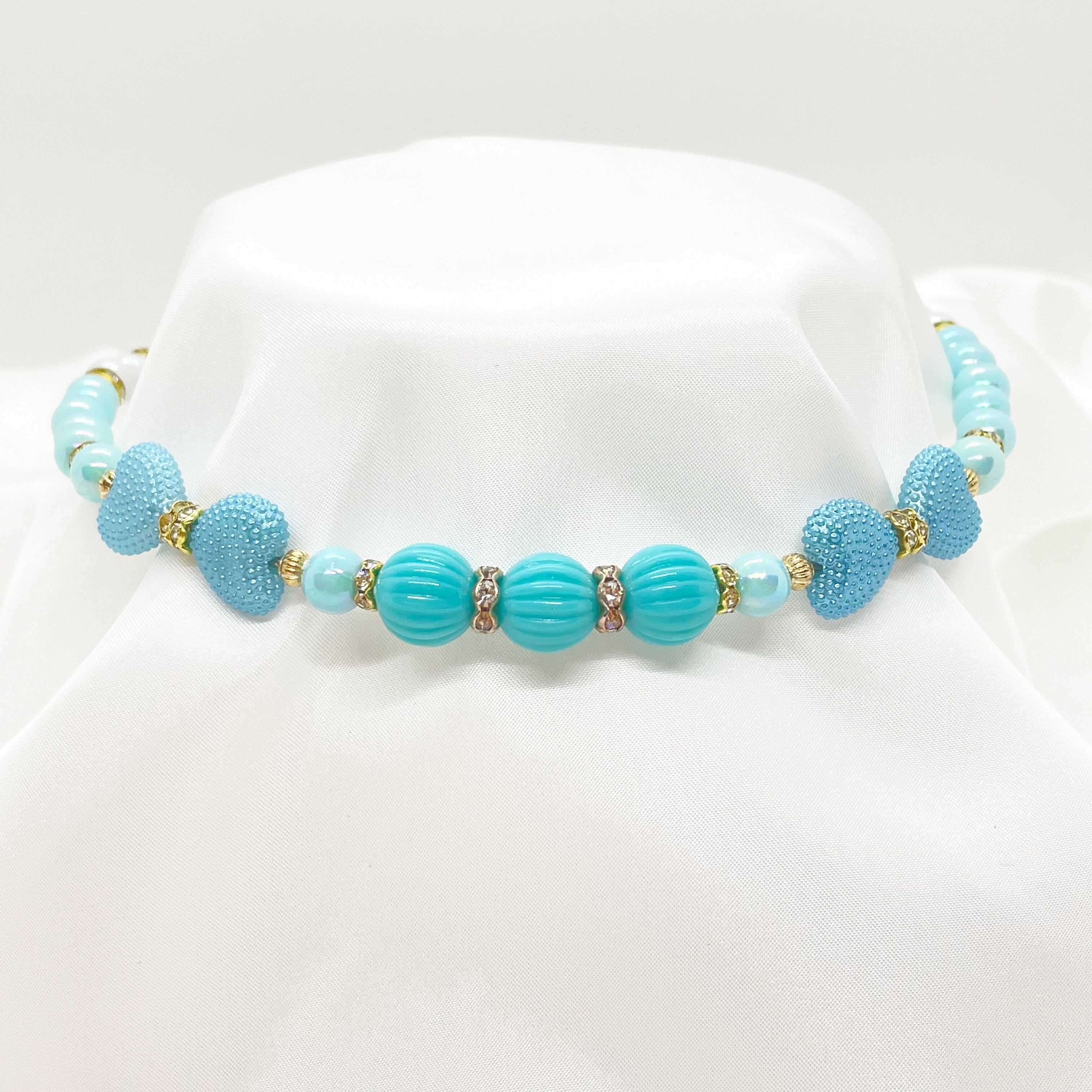 ポコポコしたハートのビーズを左右に組み合わせ、リボンのように仕上げた可愛くエレガントなハーフチョークです。